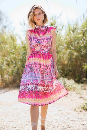 Εμπριμέ φόρεμα με βάτες και ντραπέ λαιμό .